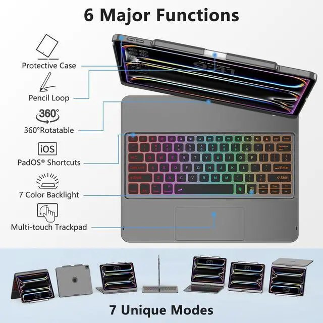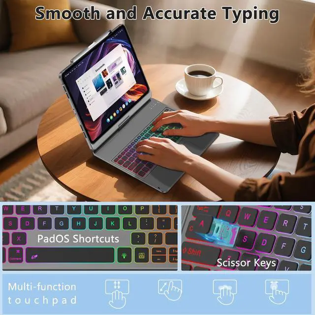 Illuminate Your Typing: For iPad Pro Keyboard 13-inch with a full row of the laptop-like iPadOS shortcuts is customized for your tablet, and allow you easily switch between adjusble 7 RGB pure backlit with 3 levels adjustable brightness, Perfect for any lighting, from late-night work to cozy cofes. Enjoy quiet, comfortable typing with customizable backlighting and ergonomic scissor-switch keys ^^