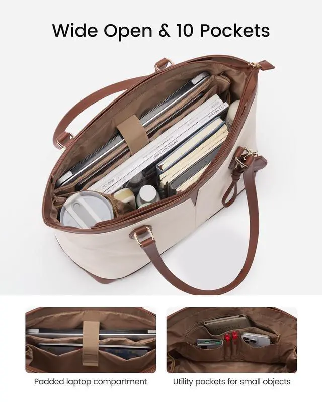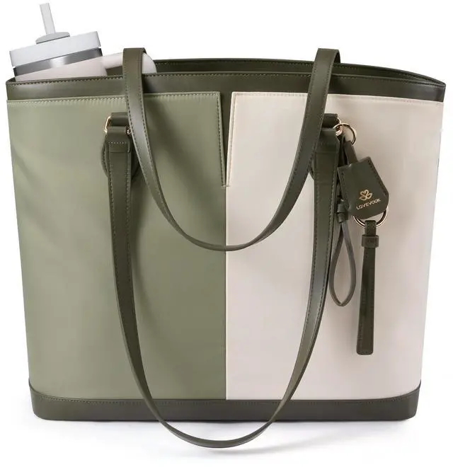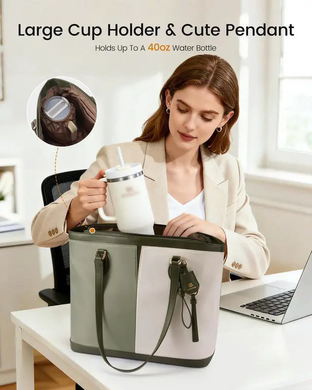 Chic & Lightweight DesignCrafted from premium splash-resistant nylon with elegant PU leather trim, this tote bag for women delivers a polished, professional look without the heavy weight of full leather. Lightweight yet durable, it stays comfortable on your shoulder all dayperfect as a work tote bag, laptop bag for women, or everyday carry ^^ Elastic Pocket for Stanley CupNo more rolling or leaking bottles. Designed with a dedicated interior elastic water bottle pocket, this tote securely fits large 40 oz tumblers. Keeps drinks upright to prevent spills while protecting your laptop, documents, and daily essentialsideal for busy workdays and travel ^^ Large Capacity with Thickened Laptop ProtectionSized at 18.5"L x 6.8"W x 14"H, this laptop tote bag features a thickened padded compartment that safely holds laptops up to 17.3 inches.