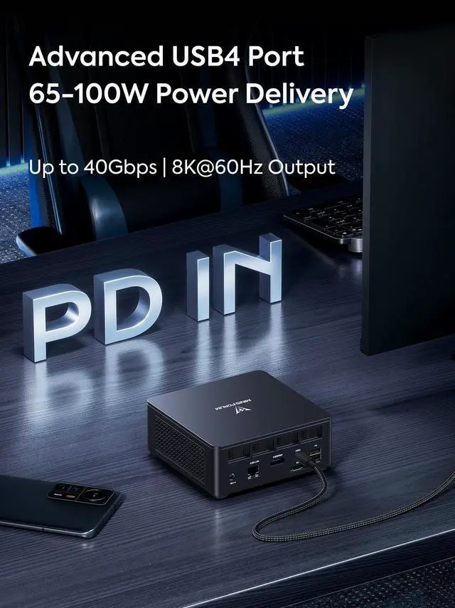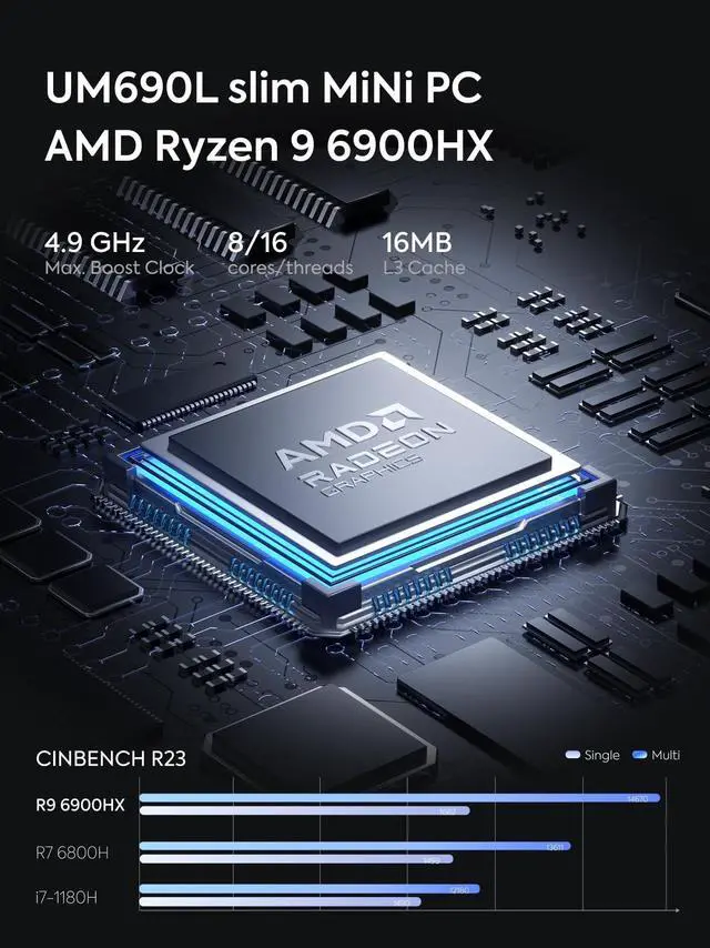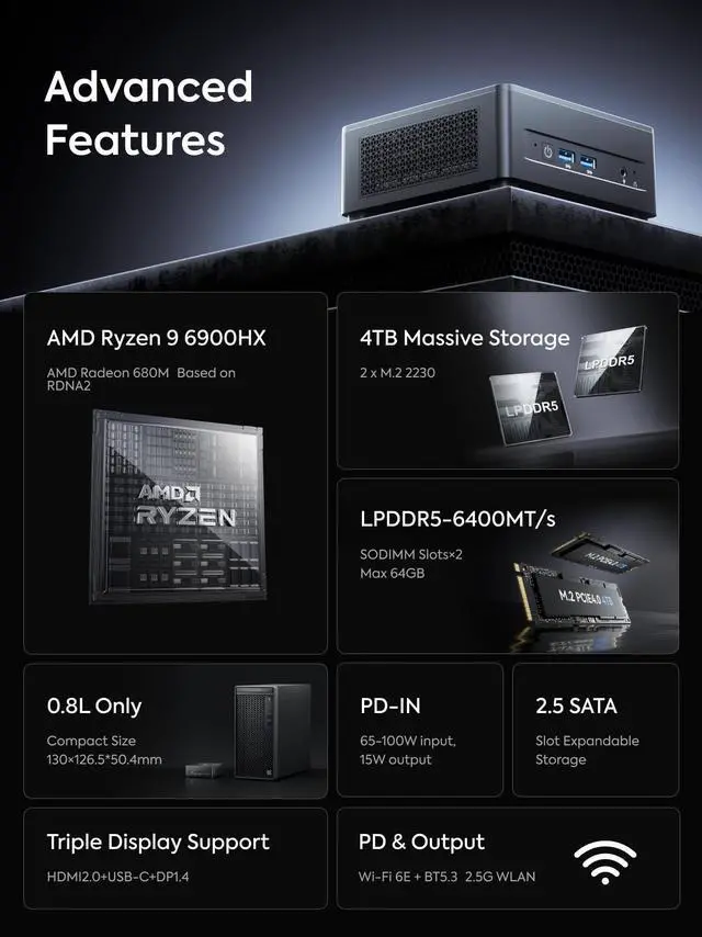 Powerful Performance Features an AMD Ryzen 9 6900HX processor (up to 4.9GH z) with AMD Radeon 680M graphics, suitable for image editing, browsing, light gaming, and programming. ^^ Versatile Display Supports triple display output with 8K@60Hz via HDMI 2.1 and USB4, and 4K@60Hz via DisplayPort, enhancing work efficiency with a wider field of view. ^^ Robust Connectivity Equipped with a 2.5G RJ45 Ethernet port, WiFi 6E, and Bluetooth 5.3 for stable, high-speed network connectivity and reduced latency. ^^ Expandable StorageIncludes 32GB LPDDR5 RAM and a 1TB PCIe 4.0 SSD, with an additional PCIe 4.0 SSD slot for expansion up to 2TB, ensuring ample storage.
