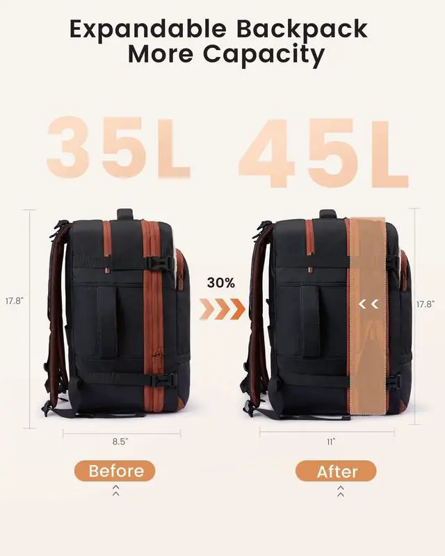 Expansive Capacity & Smart Organization: This versatile backpack has an expandable main compartment to adjust capacity for daily commutes or short trips, making it a practical travel essentials. It features multiple handy pockets, a waterproof section and padded laptop sleeve, working well as everyday laptop backpack and reliable carry on backpack. Switch easily between a tidy daily bag and roomy travel pack, keeping your belongings neat and secure on the go. ^^ With 2