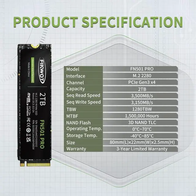 (Please note: This SSD is not compatible with PS5! ) ^^ Improve EfficiencyThe Fikwot PCIe SSD leverages 3D NAND technology and TLC particles, significantly enhancing system loading speed and power efficiency, minimizing delays in operating systems and games/software. ^^ Reliable Warranty and SupportWith up to 1, 280TBW of Durability and a 3-Year Product Registration Warranty, you can place your trust in the Fikwot brand. For any inquiries, our 24-Hour technical support team is ready to assist you.