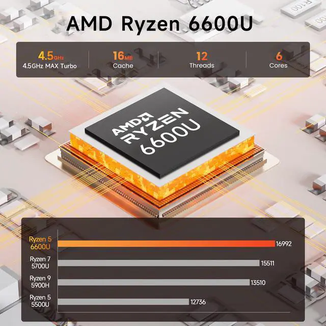 The dual LAN ports ensure a stable and uninterrupted internet connection even during high-demand usage. Perfect for tasks such as video conferencing, large file transfers, and online collaboration. Coupled with the fast and efficient Wi-Fi 6 and Bluetooth 5.2, the EQR6 Mini computer delivers a seamless and powerful performance for both work and entertainment ^^ Multi-interfacesThe mini pc Ryzen features 2 HDMI ports supporting 4K@60Hz dual screen display, providing high-definition video output and flexibility of multitasking. With 3 x USB 3.2 and 1xType-C ports boasting a transfer speed of up to 10Gbps seamless data transfer and device connectivity are effortlessly achieved. The dual RJ45 1000M port ensures stable wired network connections. In addition, it is equipped with 1 x USB 2.0 ports and 1 x 3.5 mm Phone Jack*1(Two-in-one) ^^ Brand new ProcessThe built-in power supply of this mini pc enhances portability, reduces weight, and keeps desktop tidy and stylish. 6600U mini pc uses heat treatment MSC 2.0, upgraded air ducts, and VC vapor chamber for more efficient heat dissipation, lower fan speed, low decibels, and super quiet operation. It also employs a new dust-proof design with a high-density breathable etched metal mesh at the bottom to prevent dust accumulation inside the machine and ensure trouble-free operation