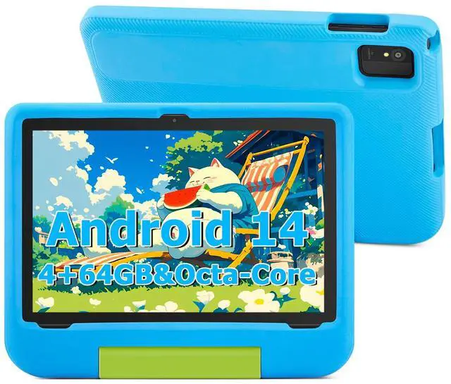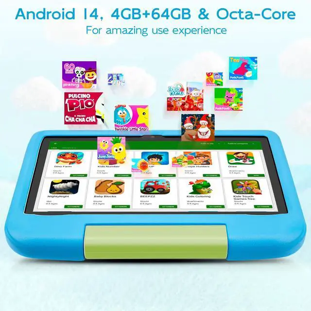 With a shockproof case and stand included, this Android 14 tablet for kids provides a comprehensive and immersive experience, perfect for children. ^^ [Android 14, 4GB RAM, 64GB Storage & Octa-Core] This Android 14 tablet features a powerful Octa-Core processor and 4GB of RAM, ensuring smooth performance with the latest OS. With 64GB of storage, it accommodates numerous educational and entertainment apps. WiFi 6 support enables fast downloads and seamless installations, enhancing your child's learning and play experiences effortlessly. ^^ [Kid-Proof EVA Protective Case] The 10 inch Android 14 Kids Tablet includes a durable protective case crafted from eco-friendly EVA material, designed specifically to withstand the active lifestyles of children.