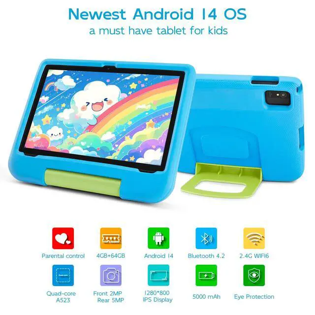 [Newest Android 14 OS] Introducing the latest Android 14 OS kids tablet, essential for every child. Tailored for ages 3-15, it focuses on a secure entertainment environment. Customize profiles, curate content, manage screen time, and ensure safe browsing. ^^ [ 10.1 Inch HD IPS Touch Screen with Eye Protection] This kids tablet features a 10.1 inch HD IPS display with a sharp 1280x800 resolution for vivid colors and wide viewing angles. It includes low blue light technology for eye protection. Powered by an Octa-Core processor with 4GB RAM, 64GB storage, WiFi 6, and a 5000mAh battery, it ensures a smooth, responsive experience.