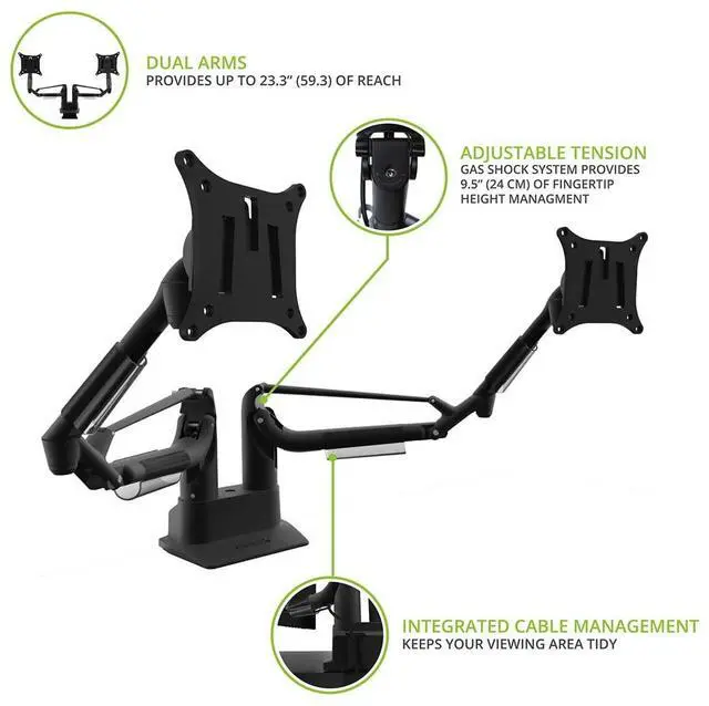 EASY INSTALLATION - The detachable base can be secured entirely from the top of your desk. ^^ GAS SHOCK SYSTEM - Freely raise or lower your screen to improve line-of-sight and reduce neck strain. ^^ UNLIMITED POSITIONS - Easily swivel, tilt and rotate your monitors for optimal viewing. ^^ WIDE RANGE OF SUPPORT - Fits any desk edge or grommet hole up to 2" thick and supports monitors weighing 3.3 to 16.5 lb. ^^ CABLE MANAGEMENT - Conveniently route your cables to ensure a clean setup.
