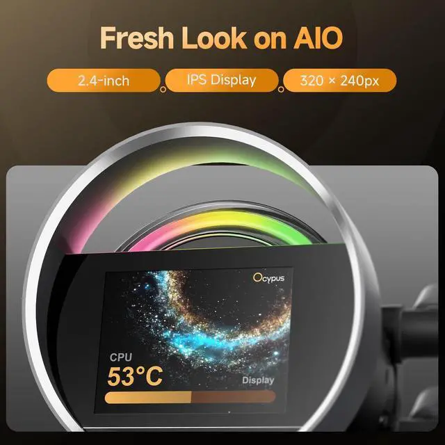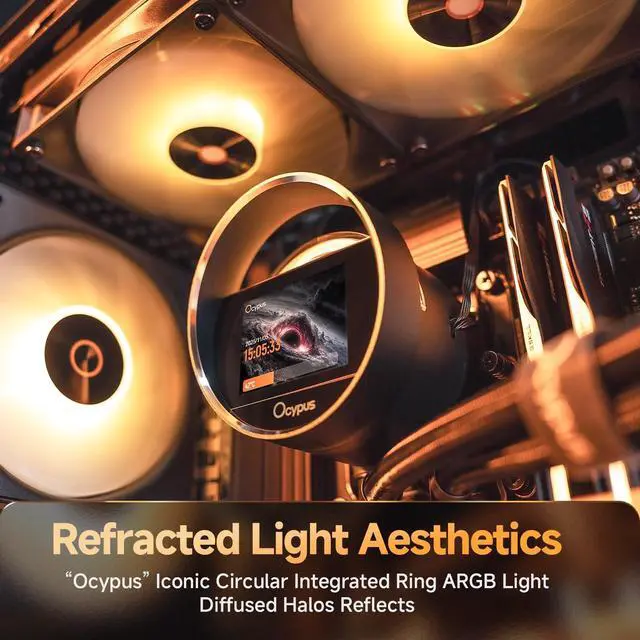 Refracted Light AestheticsDesign Futuristic Form. Crafted from aerospace-grade aluminum, the iconic circular form blends brand heritage with futuristic elegance, featuring customizable ARGB lighting effects, delivering a smooth and dynamic aesthetic. ^^ Fresh Look on AIO Paired with the all-new Ocypus Display, 2.4 inch IPS screen, 320 240 Resolution, reinvent the digital display experience, customize display at will, express your unique style without limits. ^^ Ocypus Display SoftwareThe "Ocypus Display" must be downloaded from the official Ocypus website. It supports Windows 10 / Windows 11 and requires connection via USB 2.0 port.