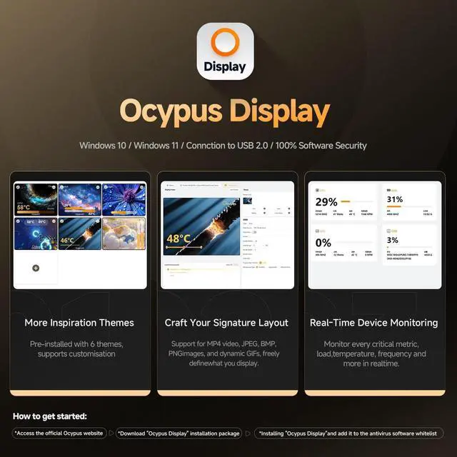 Please note, the software should be added to your system's whitelist; otherwise, it will be blocked by computer's security settings and rendered unusable. Rest assured, we guarantee the software's 100% security. ^^ Redrawing tech-aesthetics by the pixel. ^^ Customisable Screen DesignAfter installing 'Ocypus display'software, you can customise the theme and all displayed content on your cpu liquid cooler. Support for MP4 video, JPEG, BMP, PNGimages, and dynamic GlFs. ^^ Fully Unleashed PumpThis is an exceptionally efficient water cooling system! The pump features ceramic bearing, enabling running speed up to 3100 RPMLow Noise27dB (A).