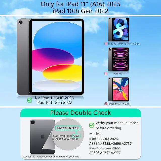 ^^ Case Compatibility: This keyboard case is only compatible with iPad 10.9 inch 10th Generation (Models A2696, A2757, A2777 ) and iPad A16 11th 2025 (Model