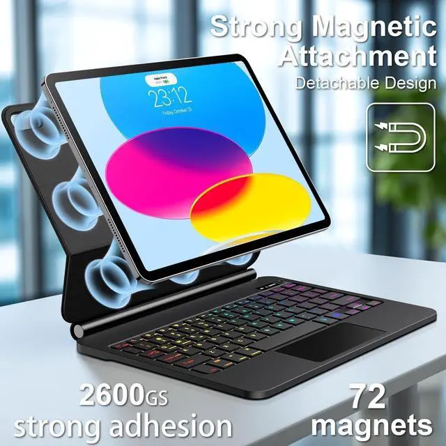 Generation: The keyboard is equipped with a 7-color backlight, adjustable to three different brightness levels. Pleas press FN + Space keys to switch 7 backlight. This feature not only adds a touch of style but also makes typing in low-light conditions more comfortable. The backlighting is engineered for optimal light diffusion, providing a pleasant typing experience whether youre working during the day or night. From dawn to dusk, adapt effortlessly! ^^ Multi-touch trackpad Keyboard for iPad 10.9 inch 10th