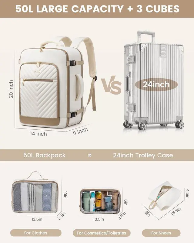 ^^ Spacious & Organized: With a capacity of 50L, 4 compartments, and multiple pockets, this travel backpack allows you to easily separate and organize your belongings. Pack 4-7 days worth of travel essentials with ease. ^^ 3 Packing Cubes This travel backpack comes with 3 additional storage pockets, a toiletry bag and a underwear storage bag and a shoe bag. This ensures your products are clean and tidy.