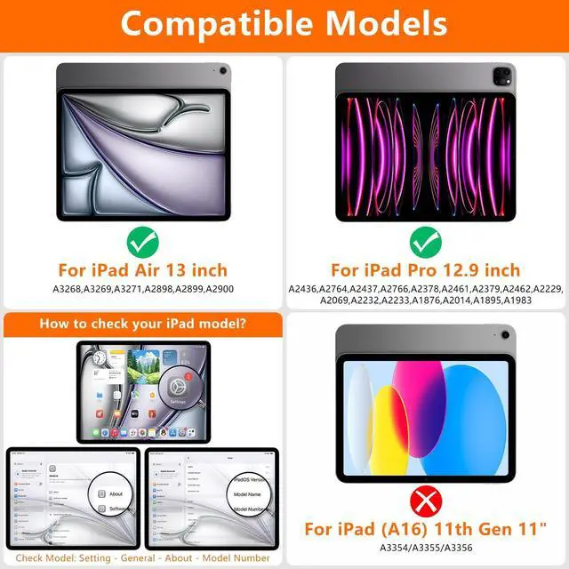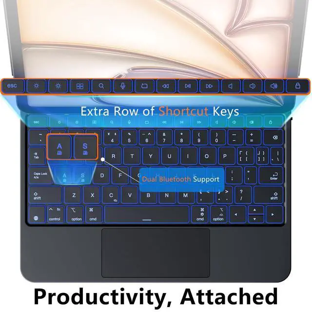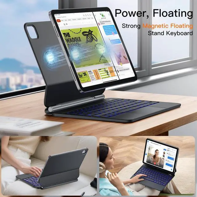 Magic-type KeyboardJUQITECH magic keyboard case compatible with iPad Air 13 M3 2025 (A3268, A3269, A3271); iPad Air 13 M2 2024 (A2898, A2899, A2900); iPad Pro 12.9 inch 6th/5th/4th/3rd Generation (A2764, A2437, A2766, A2436, A2378, A2461, A2379, A2462, A2229, A2069, A2232, A2233, A1876, A1983, A1895, A2014) ^^ Efficiency, UnlockedOur 6-Row keyboard puts media controls, brightness, and shortcuts at your fingertipsinstantly. Why press two keys when one will do? With a full 6th row of dedicated keys, you skip the Fn combos, no more hidden functions, get to work 41% faster ^^ See EverythingTired of deciphering blinking lights? Our Magic Keyboard features a crisp, integrated LED Display that puts all the essential information right in front of you.