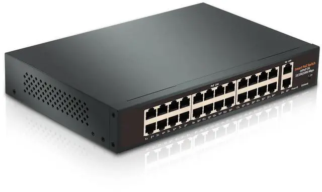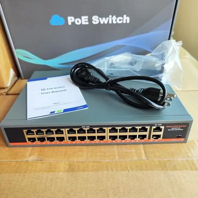 24 Ports PoE Switch Upgrade your network with our 24-port Gigabit PoE switch. With 24 PoE/PoE+ ports operating at up to 100Mbps speed and 2 Uplink port operating at up to 1000Mbps speed, you can expect excellent network performance. ^^ High Power Output With support for the IEEE 802.3 af/at PoE standard protocol, this switch provides a total power output of 400W, allowing up to 30W per port. It ensures a reliable and stable power supply, making it ideal for connecting multiple devices. ^^ Easy Plug and Play Our PoE switch features automatic detection on the PoE ports, enabling seamless connectivity for both PoE and non-PoE devices such as PoE Cameras, APs, computers, NVRs, routers, and more.