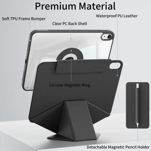 Multiple Placement Angles : This iPad a16 case multi-fold cover with a transparent, detachable magnetic back panel allows for multiple placement options, including 720rotation and vertical and horizontal placement. The transparent back panel can be detached and attached to the refrigerator. NOTE: Please remove the inner and outer film before putting on the clear back case