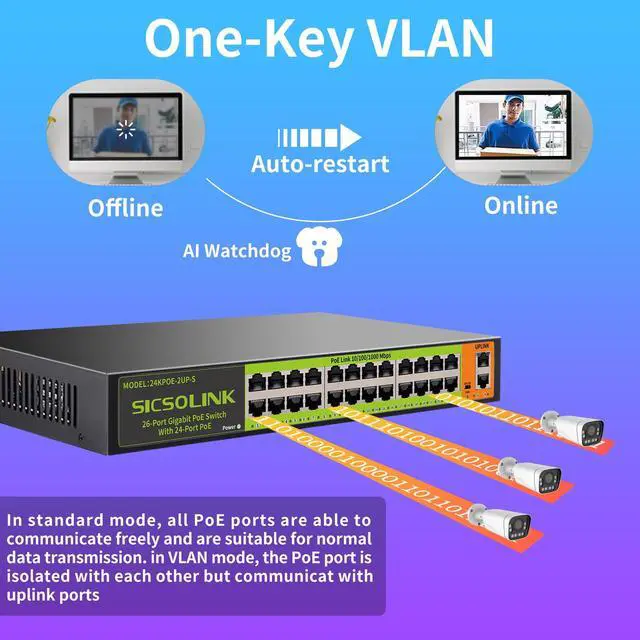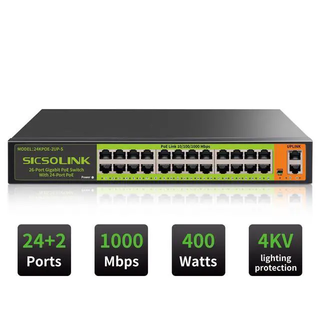 26 Ports Full Gigabit PoE SwitchThe SICSOLINK 26 Ports Gigabit Ethernet PoE Switch include 2 Gigabit uplink Ports and 24 Gigabit RJ45 Ports, all ports can provide up to 1000 Mbps speed. The 2 gigabit uplink port are used to connect to NVR, other switches, routers so that you can get real 24 Ports PoE Switch. ^^ POE SwitchSupport IEEE 802.3 af/at PoE standard, the switch can provide power and data to your PDs at same time, which is more convenient and save more cable. The total output power on 24 PoE ports up to 400 W meanwhile the maximum power of each port is 30 W, enough for the most PDs.