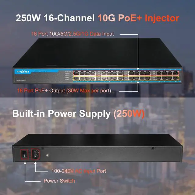 ^^ PoE Power: Built-in 250W Power Supply, each port output power of 30w Max for PoE+ devices like security camera, APs.