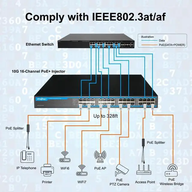 Data Speed: Transmit data with no loss of signal quality via 16 data input ports and 16 PoE+ output ports, ideal for equipments that need High-speed ethernet.