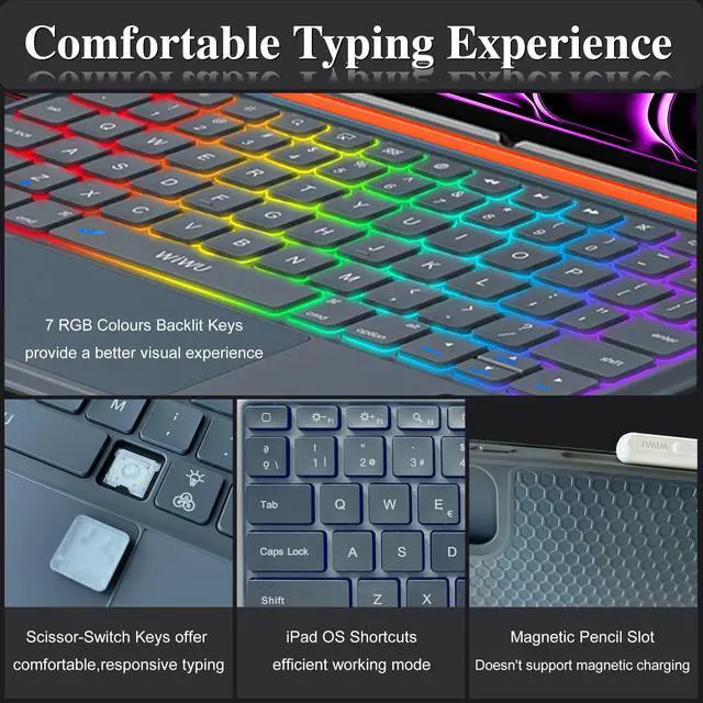 Battery Life: Scissor-switch keys offer comfortable, responsive typing with quiet 1mm travel, suitable for libraries and offices. USB-C recharging in 2 hours for up to 100 hours of use. 7 RGB colours backlit keys for comfort and productivity in any dimly lit area ^^ Precise Touchpad & iPadOS