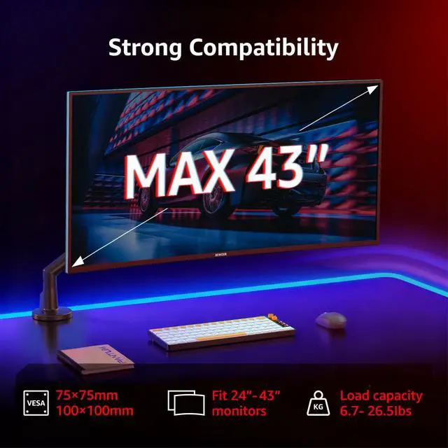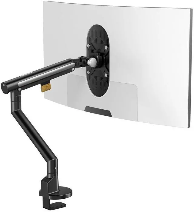 Wide Compatibility for 24-43 Inch MonitorsThis single monitor arm is specially designed for 24 to 43 inch flat/curved screens, with a weight capacity of 6.6 to 26.4 lbs. It perfectly fits most mainstream office, gaming, and ultrawide monitors, freeing up your valuable desk space. ^^ Sturdy C-Clamp Base & Pure Mechanical SpringFeatures a C-Clamp ONLY design for easy and tool-free installation on desks up to 8cm thick. Unlike gas spring arms, our durable mechanical spring mechanism provides consistent lifting force and long-term reliability without the risk of pressure decay over time.