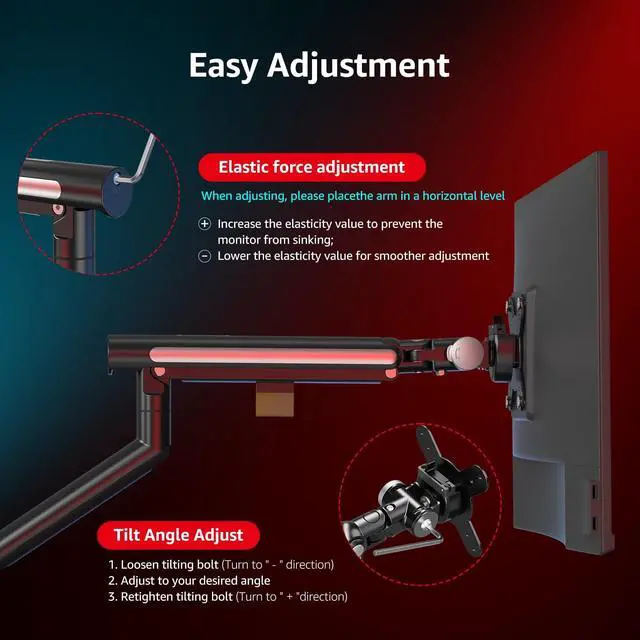 ^^ Full Motion Ergonomics for Perfect ViewingAdjust your screen to the most comfortable position effortlessly. The monitor mount offers 270mm height adjustment, 360 smooth rotation, and an extensive tilt range of +80 (up) to -10 (down), promoting a healthier posture whether for work or gaming. ^^ Robust Build & Universal VESA MountConstructed with high-quality aluminum alloy through die-casting and precision processing, ensuring stability and shake-free performance even at full extension. Comes with standard 75x75mm and 100x100mm VESA patterns, making installation quick and universal. ^^ Simplify Your Setup & Trusted QualityWe cut the redundancy and deliver what you truly need: a simple C-clamp, a reliable mechanical spring, and broad compatibility. Each mount undergoes strict quality control to ensure it securely holds 6.6 - 26.4 lbs, providing a premium and hassle-free experience for your workspace.