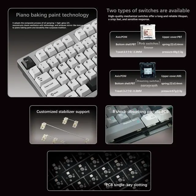 PRODUCT HIGHLIGHTS CNC-milled 6063 aluminum alloy case Gasket-mounted with five-layer acoustic dampening 304 stainless steel mirror weight 5-second magnetic case disassembly Tri-mode connectivity (USB-C, 2.4G, Bluetooth) VIA and VIAL support Per-key hot-swap PCB Linear (Pink Robin) or tactile (Fantasy Dream) switch options IC RGB lighting with MCU control 6000mAh lithium battery with charge-while-you-type SPECS