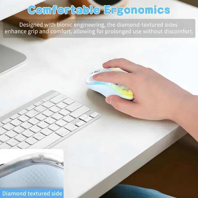 ^^ **Ergonomic Comfort**: Designed with an ergonomic shape and diamond texture on both sides, the mouse offers a seamless grip and prevents slipping for extended use.