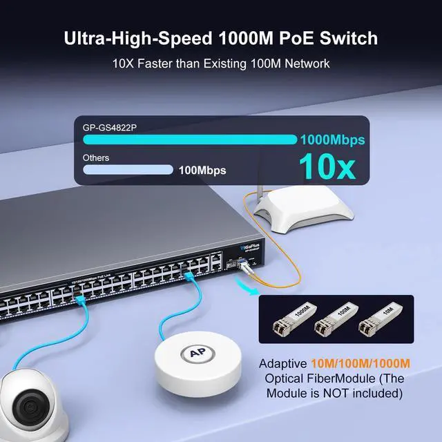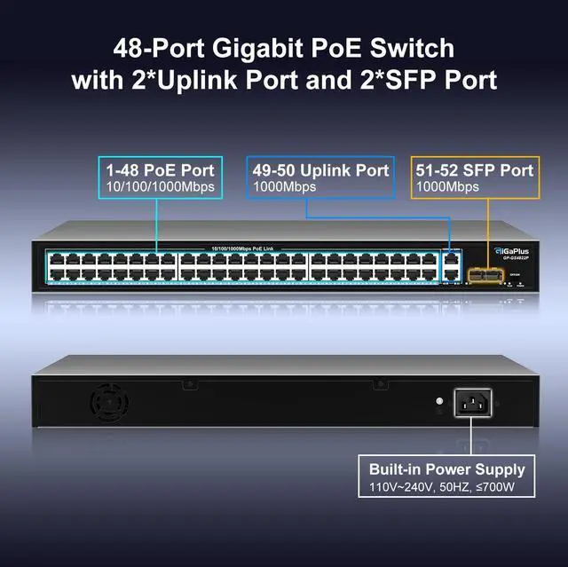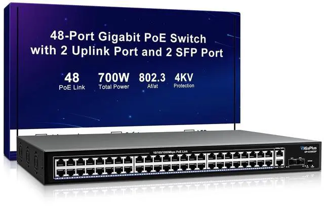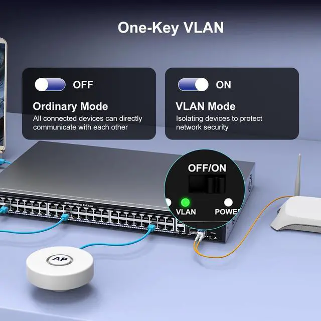Port Gigabit PoE+ Switch: This 48-port Gigabit PoE+ switch features 48 PoE+ RJ45 ports and 2 Gigabit uplink, 2 Gigabit SFP ports for connecting to NVRs, the Internet, and more. With high-speed data transmission and power delivery over the network cable, it offers a reliable solution for your devices. ^^ One-Key VLAN mode for enhanced security: The 48-port power over ethernet switch features a One Key VLAN mode that isolates the 1-48 ports from each other while still communicating with the uplink ports, improving network security and bandwidth utilization.