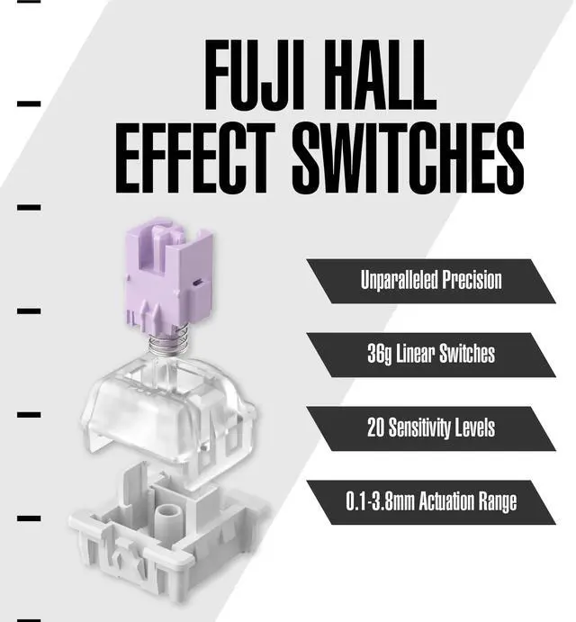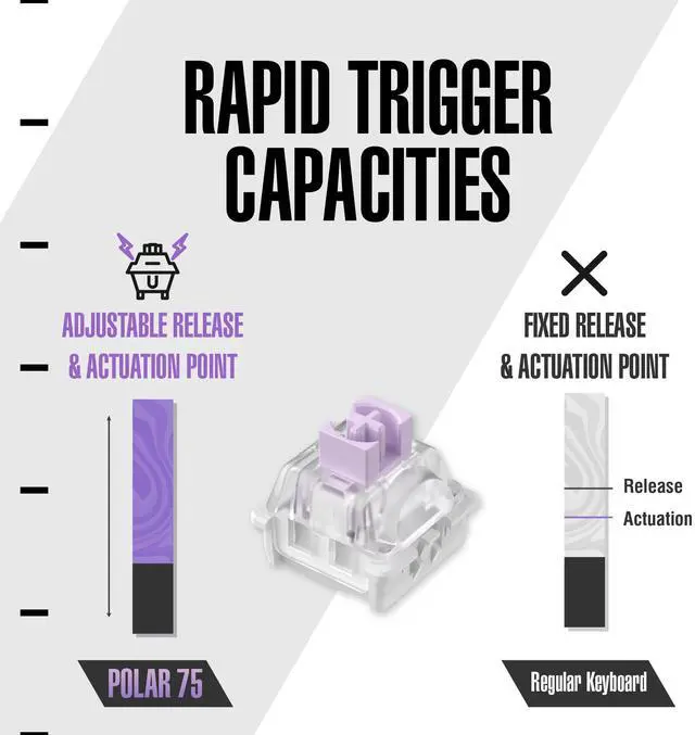 Elevate your gaming experience with the Arbiter Polar 75 - Magnetic Gaming Keyboard. This premium 75% compact keyboard features Gen 2 Fuji Hall Effect Magnetic Switches, offering 20 customizable sensitivity levels from 0.1 mm to 3.8 mm for precise and smooth control. The continuous rapid trigger with less than 1ms latency ensures ultra-fast inputs, ideal for competitive gamers. Crafted with a CNC aluminum frame, the Polar 75 combines elegance and durability, providing a stable foundation for intense gaming sessions. Customize your setup with 16 vibrant RGB lighting modes and personalized configurations via the webapp software.