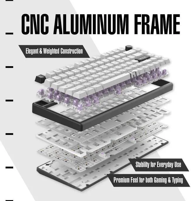 Designed for stability and comfort, the keyboard includes dual silicone dampening for quieter, more comfortable typing, a screw-in stabilizer on the spacebar, and additional plate-mounted stabilizers to minimize rattling. The 1.8 m braided USB cable ensures reliable connectivity, making the Arbiter Polar 75 the perfect blend of innovation and performance for gamers and typists alike.