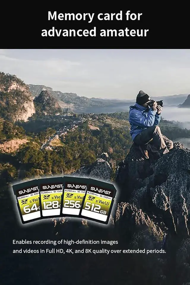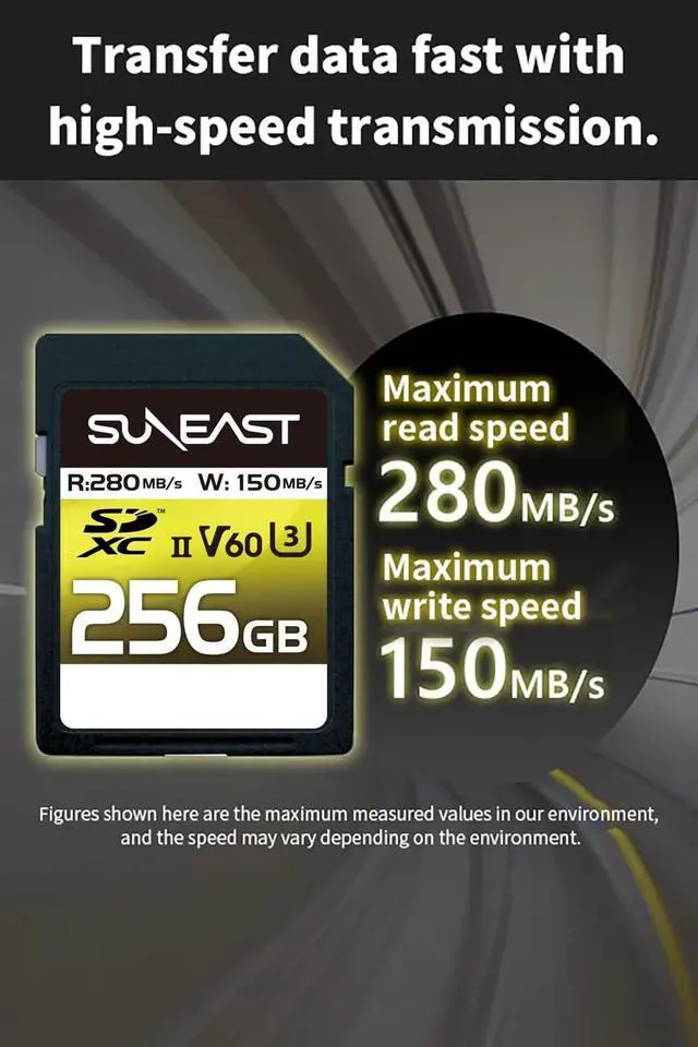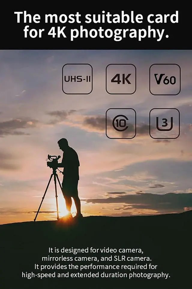 Record cinematic-quality 4K video at 60p, thanks to its V60 video speed class (4K UHD 3840 2160 at 60 fps; compatibility may vary by host device). ^^ Fast File Transfers Achieve read speeds of up to 280MB/s, allowing for quick and efficient file transfers, so you can save time on large file moves, ideal for busy workflows. ^^ High-Speed Continuous Capture With write speeds up to 150MB/s, this card is ideal for capturing continuous burst photos, time-lapse sequences, and high-speed video, ensuring no missed moments. ^^ Durable for Extreme Conditions Built to operate between -25C-85 C (storage from -40-85 C), ideal for professional outdoor use.
