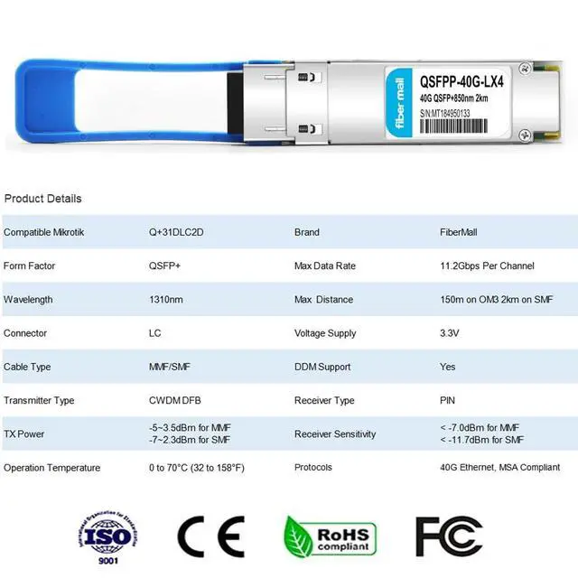 40G QSFP+ UNIV Transceiver Module, 40GBASE-LX4, single mode and multimode, 1310nm, 4CWDM, OM3/150m /MMF, SMF/2km, LC duplex connector, Hot Pluggable, support DOM ^^ 40GBASE-LX4 Built-in high performance Chip, Max. Power Consumption 3.5W enable Prolonged Service Life, Commercial Temperature Range 0 to 70C (32 to 158F) ^^ Built-in Real Time Digital Optical Monitoring Capability for Strong Diagnostic Capabilities ^^ Protocols Compliant with QDR/DDR Infiniband data ratesUp to 150m transmission on OM3 multimode fiber (MMF) or 2km transmission on single mode fiber (SMF). ^^ Hot Pluggable QSFP+ Form Factor, Compliant to SFF-8436, QSFP MSA and ROHS.