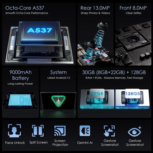 The crisp HD screen delivers vibrant colors, sharp contrasts, and wide viewing angles, while the blue light filter and eye-care design reduce strain during extended viewing. Dual stereo speakers, a 3.5 mm audio jack, and USB support for lossless audio formats ensure an exceptional audiovisual experience for movies, shows, and music. ^^ [Huge Storage, GMS Certified & Quick Connection] Enjoy massive storage with this Android tablet, featuring 30GB RAM (8GB physical + 22GB virtual) and 128 GB internal storage, expandable up to 1TB with a TF/microSD card.