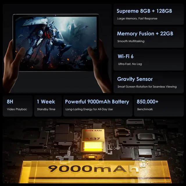 GMS-certified, it gives you access to over 4 million apps on Google Play, from TikTok to Google Meet, ensuring a fully integrated experience. Stay connected effortlessly with dual-band 5G/ 2.4G WiFi and Bluetooth 5.0, delivering fast, stable internet and smooth wireless device connections for work, study, gaming, and streaming. ^^ [Smart Productivity & Long-Lasting Battery] Power through work, study, and creative tasks with the 9000mAh long-lasting battery. Includes keyboard and mouse for smooth typing and navigation. Enjoy 1s Face Unlock, Split-Screen multitasking for running two apps at once, and Screen Mirroring to cast content to your TV or projector.