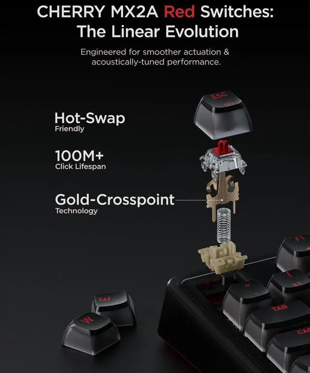 CHERRY MX2A SwitchesCrafted in Germany, these switches feature Gold Crosspoint Contact technology for smoother actuation, improved acoustics, and a 100-million-keystroke lifespan. Their hot-swappable design allows for easy, solder-free customization ^^ Split-Second Reaction Enjoy tournament-level performance with 4000 Hz wireless and 8000 Hz wired polling rates for under 0.3 ms latency. Full N-key rollover supports you in complex scenarios, ensuring your commands are captured with precision ^^ Tri-Mode Connectivity This PC keyboard provides a versatile three-in-one connection solution. Enjoy a reliable USB-C wired connection, low-latency 2.4 GHz wireless, or Bluetooth mode to effortlessly switch between three different devices ^^ Gasket-Mounted Enjoy a smoother and more pleasant typing feel from the gasket design and multi-layer internal padding.