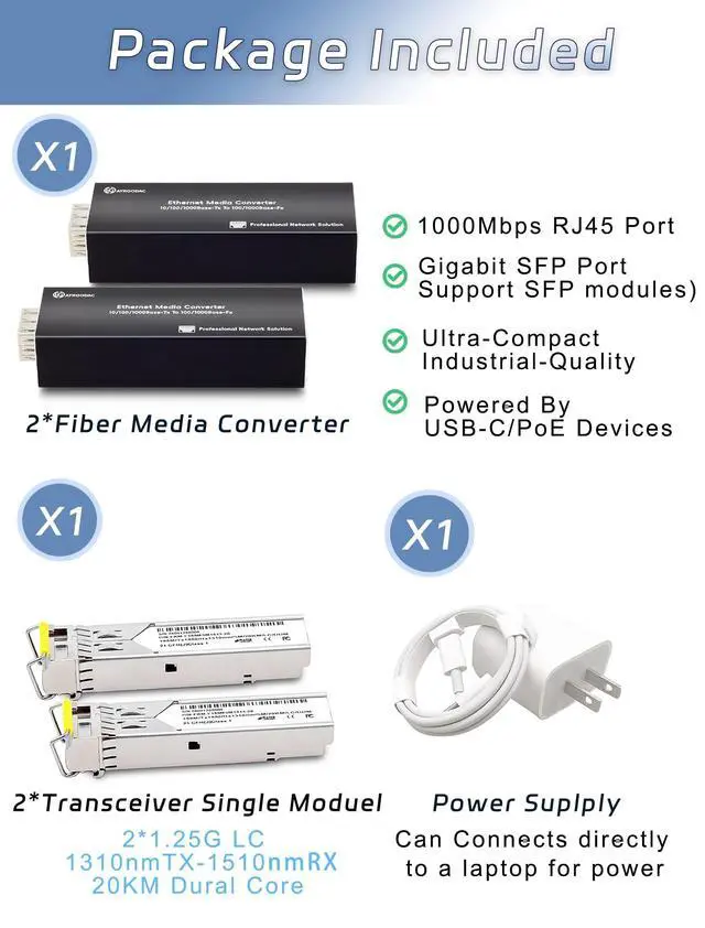 What You Get: A pair of plug-and-play fiber media converters; 2 pcs BIDI 1.25G 1310nm TX/1550nm RX LC single transceiver modules (up to 20KM); 2 pcs charging plugs and USB-C cables; 1 user manual ^^