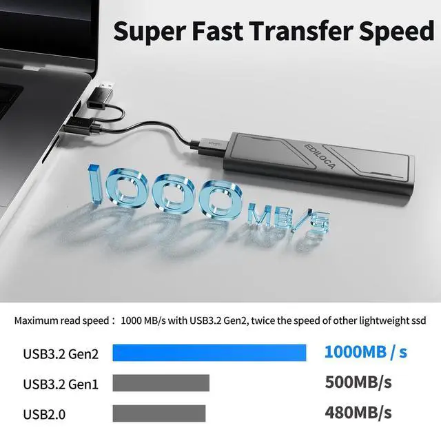 Gen2 interface: This 1TB external SSD delivers lightning-fast data transfer. Read speeds reach up to 1000MB/s, and write speeds up to 950MB/s (USB 3.2 Gen2 interface required for optimal performance), several times faster than traditional hard drives. ^^ Rugged and lightweight aluminum alloy casing: This 1TB external SSD features a sleek, impact-resistant, fingerprint-resistant unibody aluminum alloy casing, combining portability and protection.