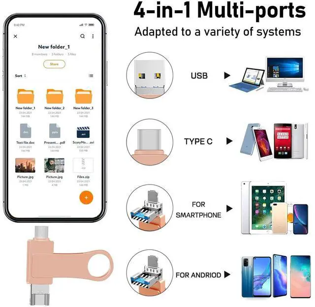 Marryler 4-in-1 Smart Flash Drive with Mobile App Control-512GB Cross-Platform Storage Solution for i OS/Android/PC/MacIntelligent File ManagementAuto-sorts files into Photos/Music/Videos categoriesSupports 35+ formats including MKV, MP4, PDF, ZIP (full list in specs) Folder creation ^^ Batch renaming ^^ Drag-and-drop sharing ^^ Multi-selectDirect camera-to-drive storage with accelerated transfer protocoli OS App Integration - Requires free "Coodisk" app (i OS 8+)One-tap backup for photos, contacts & social media filesTouch ID + numeric password protection (activated via app) Real-time storage capacity monitoringThird-party player support (VLC/MX Player compatible)Android devices do not needsoftware but need to support OTG function. Full Platform Compatibility Windows XP/7/8/10 direct read/write macOS 9.