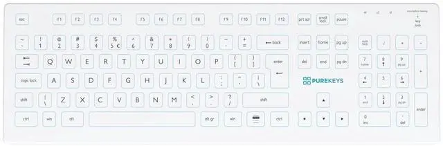 With the Purekeys Full Size Medical Keyboard you can enjoy a comfortable typing feeling and the optimal hygiene of a completely flat keyboard. The high-quality silicone top layer is very quick and easy to clean with a wipe. When cleaning, press the special "cleankey" and the keyboard is switched off so that you do not type anything while cleaning. This keyboard is ideal for hospitals and dentists. Next to the letter area, this Full Size keyboard has a section for the arrow keys and certain function keys. In addition, it also features a separate numeric area for quick entry of numbers and special characters.
