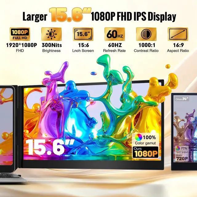 ) ^^ [Triple screen, Triple efficiency] This portable monitor is a perfect triple screen monitor for laptop, allowing you to open multiple windows simultaneously without switching back and forth continuously on a single laptop screen, improving your efficiency up to 300%. With this monitor extender for laptop, you can easily build your own working station wherever you like. Super suitable for conference presentations and multitasking. Perfect for gamers, programmers, finance and investment professionals, designers, and anyone who needs more efficient workflows. ^^ [Ultra thin 15.6" Screen]The upgraded ultra-slim laptop screen extender is just 4mm thick (sigle screen) thinner than most smartphonesand built for true portability.