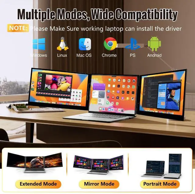This triple monitor for laptop is compatible with devices such as Windows, Mac, Chrome, Android, Linux, Dex, and even the Switch. Please read the manual carefully before use.