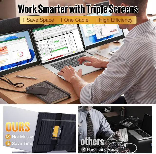 This triple portable monitor fits effortlessly into your bag without adding any bulk, making travel a breeze. Whether you're a frequent traveler, digital nomad, or remote worker, this super thin screen extender is the perfect productivity companion on the go. The triple monitor is also a thoughtful and practical gift for anyone who needs to work efficiently. ^^ [Gifted Package and Trusted Service] laptop extended monitor portable has gift package! Each laptop screen extender monitor portable includes 1 screen, 2*Type-C cable, 1*USB-A to USB-C cable, and 1*power adapter, 1 Newbie Quick Guide, 1 instruction and a well made carriage bag.
