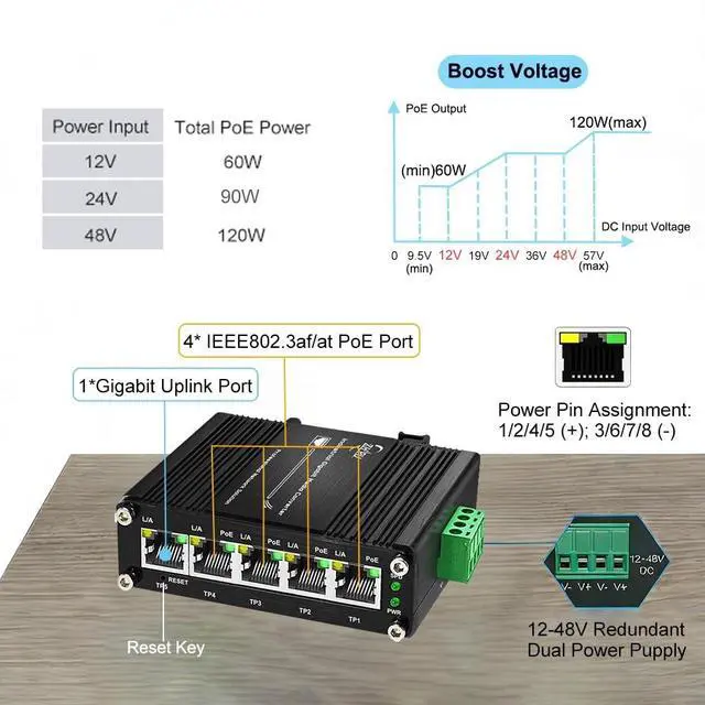 - Supports 12 - 48V wide voltage DC input for power redundancy, power can up to 120W PoE budget (DC48V input), 90W (DC 24V input) or 60W (DC12V input). ^^.