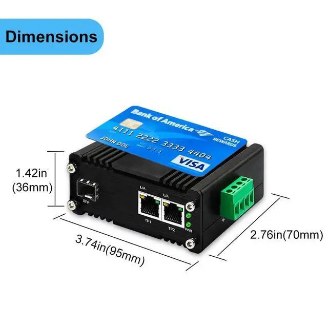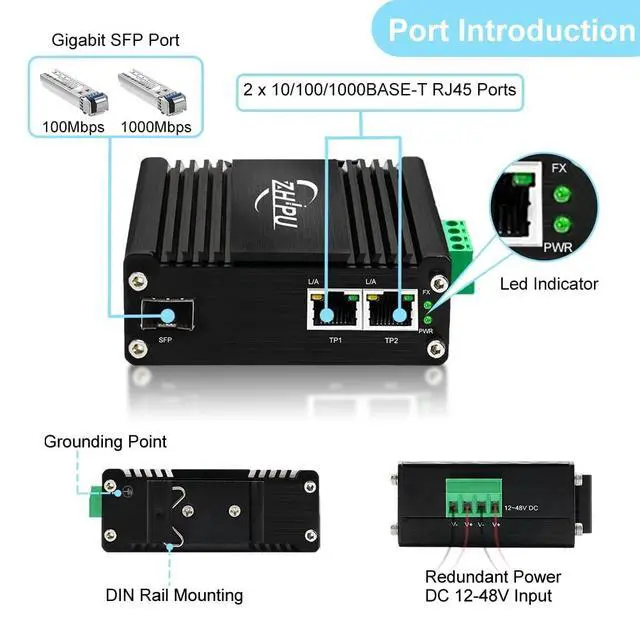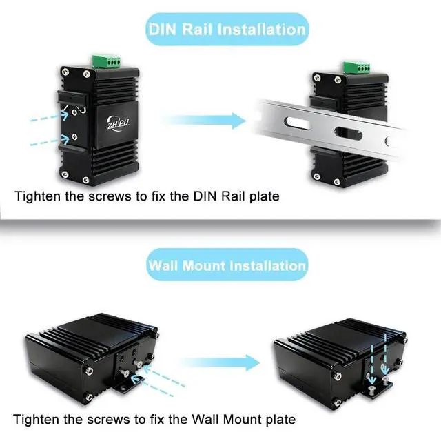 ^^: 6000V surge protection capability. Can operate under the temperature range from -40F to 167F. Small size 7.342. 761.38 in (907035mm). Suitable for monitoring confined spaces. ^^ - & Industrial grade aluminum alloy housing comes with 35mm din-rail mounting bracket and wall mount accessory, can install on universal din rail slot. ^^ The 2 port industrial switch is ideal for Solar Power/VoIP/RV TruckSurveillance Network, Industrial Automation, Intelligent Transportation.