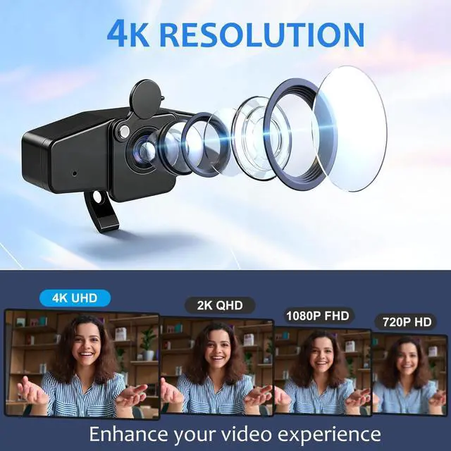 Frame Rates: This desktop computer camera delivering crystal-clear 4K resolution at 30FPS with smooth frame ratesevery frame packed with detail. Equipped with an 8MP CMOS sensor, it boosts low-light sensitivity for clear, lag-free video during meetings. Whether joining online meetings, live streaming events, or taking virtual courses, enjoy exceptional image quality without distortion or lag. ^^ PDAF Auto-Focus & Automatic Light Adjustment: This 4K web cam employs advanced Phase Detection Auto-Focus (PDAF) technology with a focus range from 0.1 m to 5m (approx. 0.33 - 16.4 ft), quickly locking onto subjects to eliminate blurry images. Combining auto-exposure and white balance correction, this Webcam for PC intelligently adjusts brightness and color based on ambient light, delivering naturally rich image quality even in backlit or low-light conditions. ^^ USB