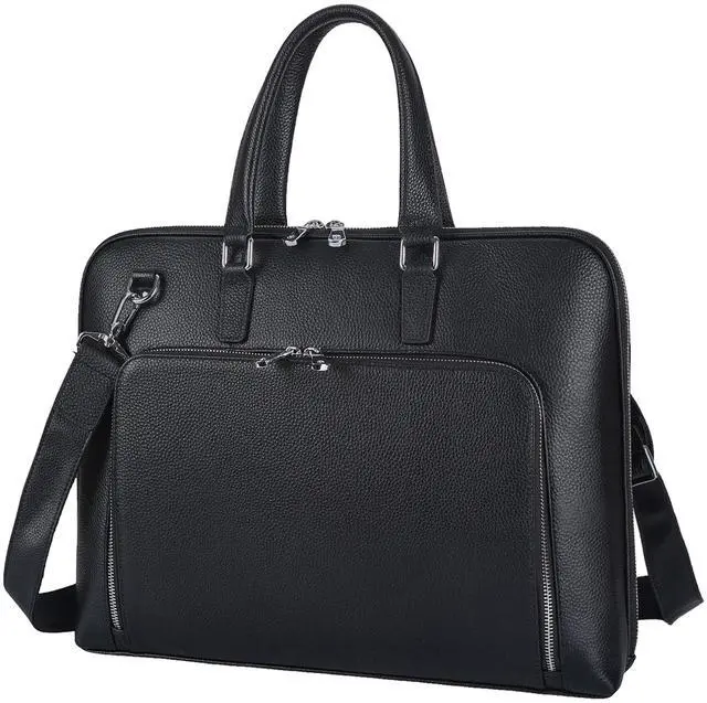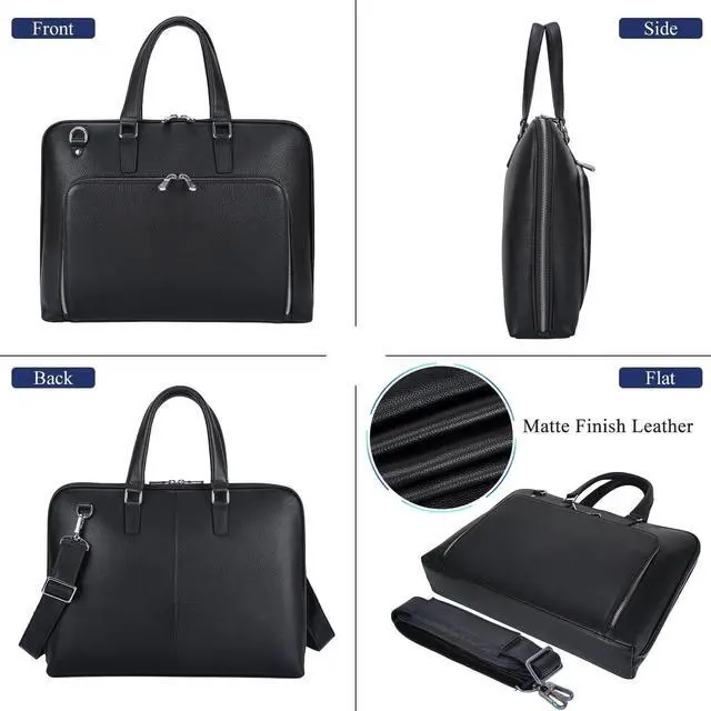 Quality Material This slim briefcase is handmade of black authentic cow leather with matte finish, with greatly flexibility and soft texture, also water-resistant ability to withstand light rain or splashing water. Outfitted with silver tone sturdy ykk zippers and thick hardware, tear-resistant polyester liner to last long time. Choose a worthwhile durable leather bag to accompany your business work! ^^ Large Size & Multi StructureBag size: 16.5" (L) x3" (W) x 12.6" (H), weight: 3.09 lb/ 1.4 kg, adjustable