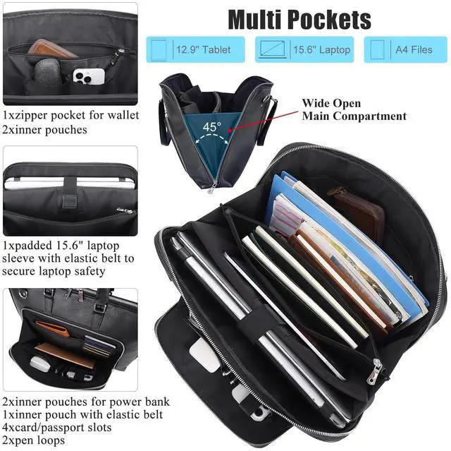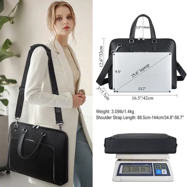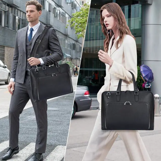Structure: 1 compartment including 1x padded sleeve for 15.6" laptop, 2x inner zipper pockets & pouches; 1 front zipper pocket including 2x pen loops, 3x inner pouches, 4x card slots. The bag can organize your A4 file folders, 15.6 - 16 inch computer, wallets, mobile phone, power bank, pens, cards, passport, keys and tablet well. ^^ Professional DesignClassic dress style brief case fits for both men and women, a good bag for businessman, office work ladies, lawyer or attorney, commuters, company executives, administrative officers. According research, we only have 7 seconds to make a first impression. Good impression helps to achieve success. The briefcase bag is a good accessory to create a positive image of professional confidence. Black leather is perfect match to formal dress. ^^ Multi OccasionsThe thin leather bag can be carried as top handle briefcase, cross body messenger bag, or single shoulder bag. It can work as laptop briefcase, executive bag, business document organizer bag, attache case, daily work commuting bag. A wonderful gift for your male and female friends or family members on college graduation, birthday, anniversaries, Valentines day, Mothers Day, Fathers Day, Christmas, and New Year etc.