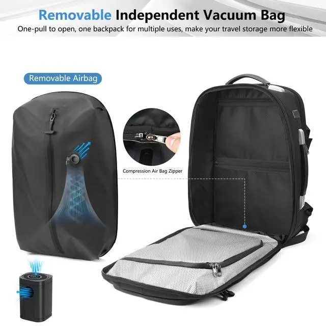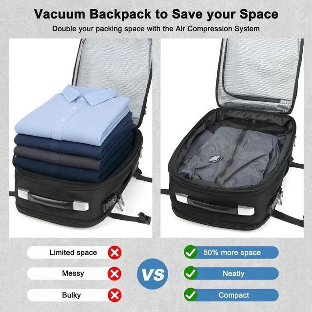 Space Saving: Designed to elevate your travel experience like never before. Integrated with vacuum compressionsystem, allowing you to pack up to 50% more items than a regular backpack, giving you the freedomto pack everything you need without the hassle of bulky luggage.