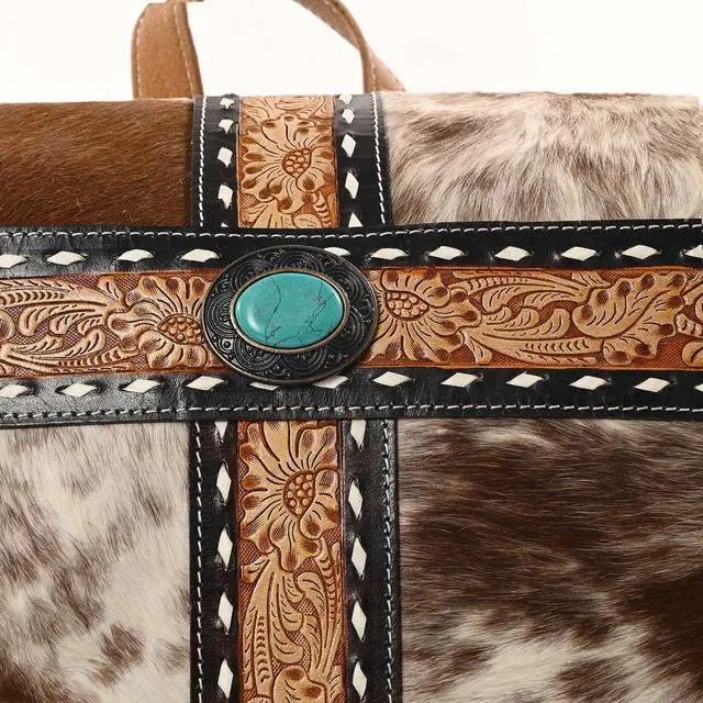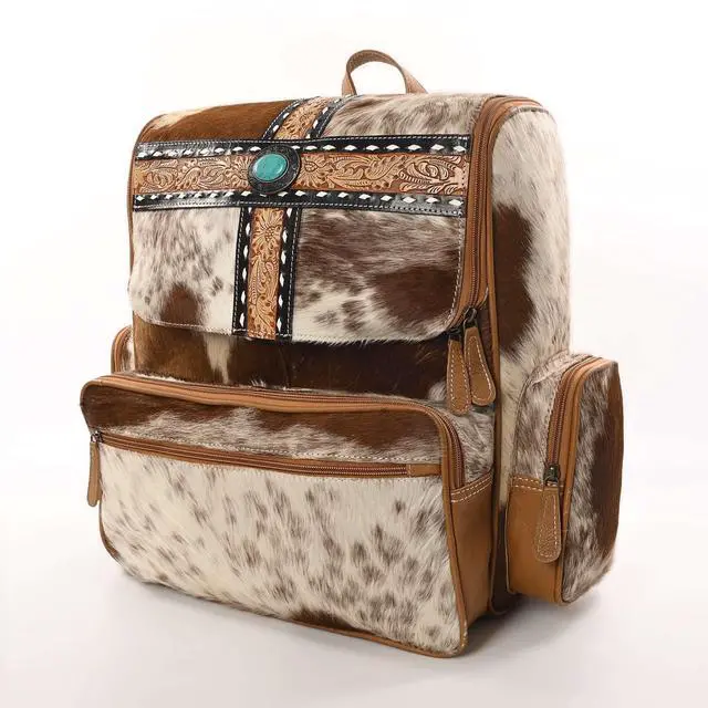 DescriptionMerbaa Saddle Singer Cowhide Laptop Backpack is a fusion of fashion and functionality. Crafted from premium Cowhide Hairon, this backpack offers both durability and a touch of Western culture charm. Weighing just 3.19 pounds, it's lightweight and comfortable for all-day wear. Featuring a spacious main compartment, it's designed to keep your essentials organized. Interior zip pockets are perfect for securing smaller items like keys, phone, or wallet. Additionally, the backpack boasts 2 zip pockets on the front, 2 on the side, and 2 concealed carry compartments for added convenience and security.