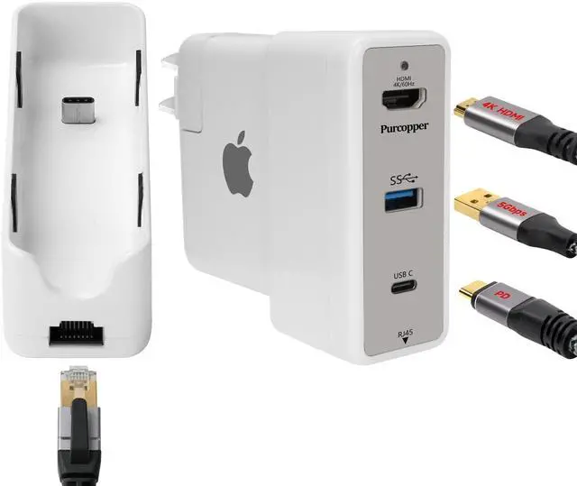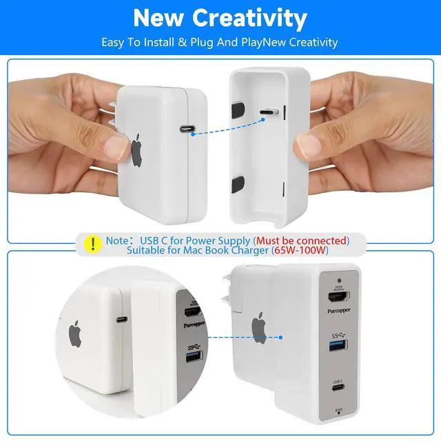 Hub New Upgrade : This docking station replaces the traditional hub function and is the perfect solution for expanding macbook ports. Simply place it on the original charging head of an macbook and connect it to the macbook via the USB-C port to achieve both charging and port expansion. (Note that this adapter is only compatible with MacBook 65W-100W charger.)