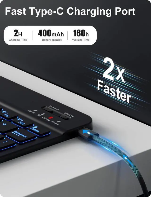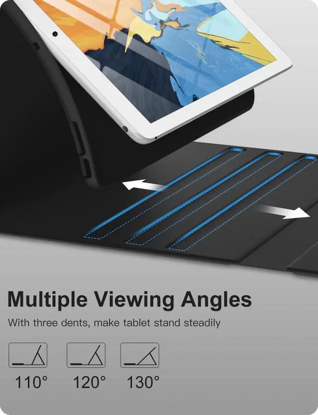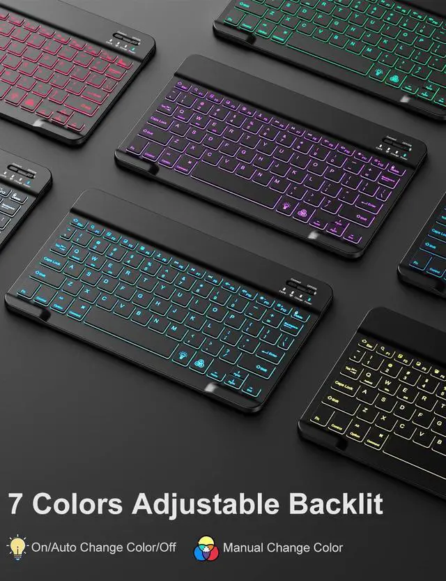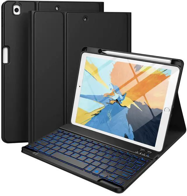 Number: A1701/A1709/A1852). Please check the model number starting with "A" on the back of your tablet before purchasing ^^ Rechargeable and Long Life BatteryOur for ipad 9th generation case with keyboard built-in 400mAh large capacity battery, more energy saving and lower consumption, ensure you can use at least 180 hours. It can be fully charged in 2 hours with Type-C charging cable, don't need to replace battery ^^ Adjustable 7 Colors Backlit KeyboardThis for ipad 8th generation case with keyboard designed with laser-etched backlit keys that allow 7 vibrant colors to shine in the dark, illuminated typing is more fun and easy. Ergonomic and mechanical scissor keys with rebound feature to reduce noise, enjoy comfortable typing even long hours ^^ Multiple Viewing AnglesThis for ipad 7th generation case with keyboard has 3 grooves to adjust the viewing angle as you like, make your tablet stand steadily. Perfect for studying, working, writing, reading or watching videos ^^ Magnetically Detachable KeyboardThis for ipad 10.2 case with keyboard is magnetic so it can be easily repositioned or removed from the case. Equipped with useful shortcut keys and compatible with IOS, Windows, Android system, provides you with ultimate convenience ^^ Convenient Pencil HolderDesigned with pencil holder and pen slot on top, the cutout in the back makes it easy to take the stylus out for use.