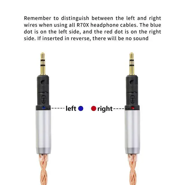 Note: R70X R70XA headphone adapter/cable must be strictly differentiated between left and right use, the blue dot is the left side, the red dot is the right side, left and right plugged in the opposite will be no sound, so you need to pay attention to the use of the situation caused by the product problem. ^^ 16 Core Hand-Woven OFC High Purity Oxygen Free Copper CableBy using High quality gold-plated plugs, stable connections and high conductivity are achieved. 32 high-purity oxygen free copper wires are used per share, eliminating resistance in music signal transmission, Achieved clear sound quality, which effectively reducesthe loss during signal transmission. ^^ Adopt Woven StructureEnhance the spatial sense of the sound low-frequency full and solid sound transparentand smooth, mid-frequency round and smooth. The high frequency is clear and not dull and fuzzy. ^^ Sound CharacterThe 16-strand oxygen-free copper upgrade wire enhances the thickness and density of thesound to varying degrees. It adds a sense of power to the low frequencies, provides a warmand cohesive sound in the mid and high frequencies, and naturally extends the highfrequencies with enhanced brightness and layering.